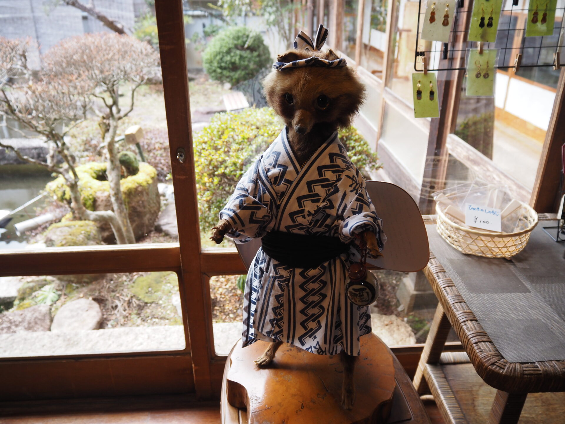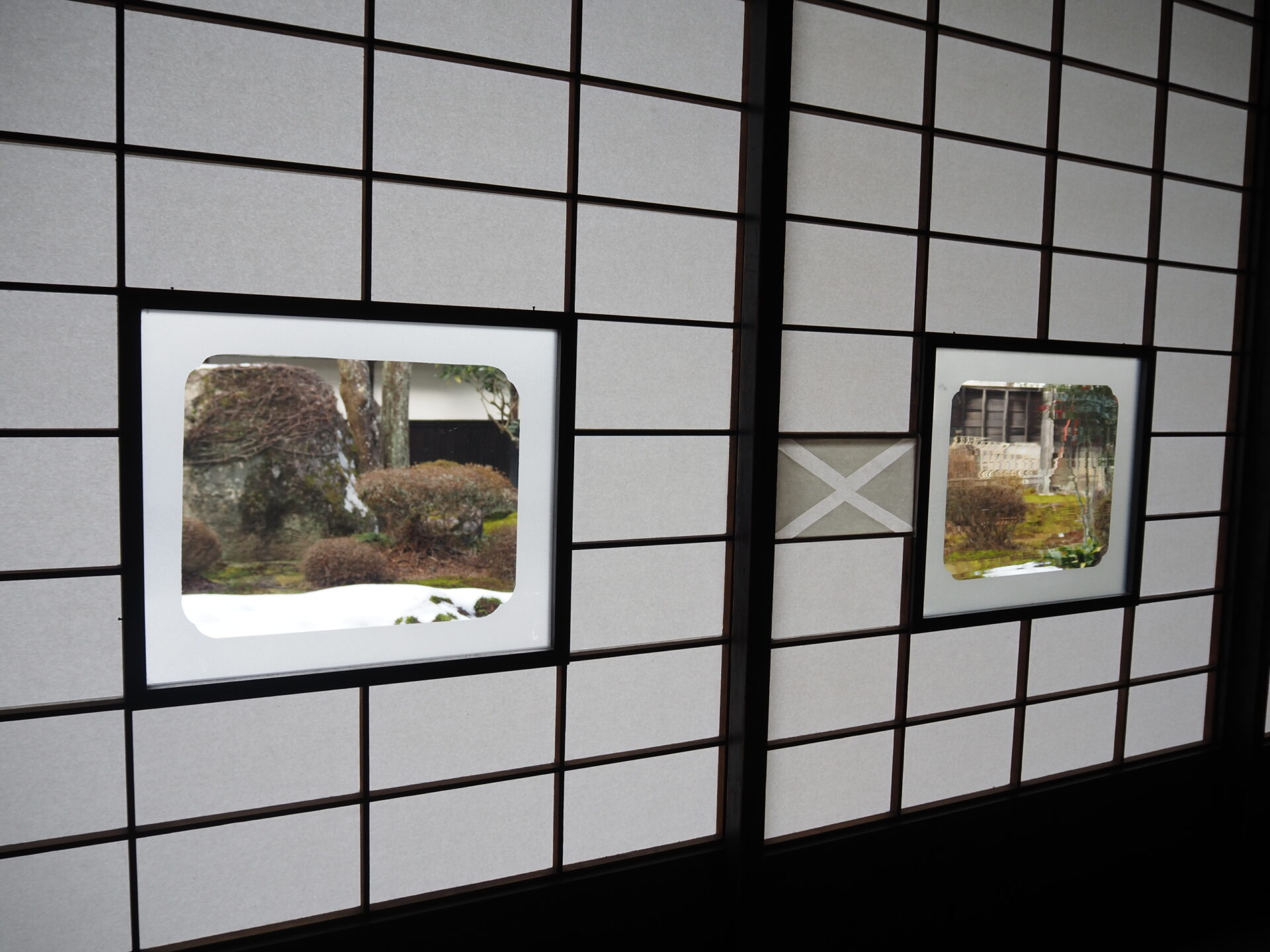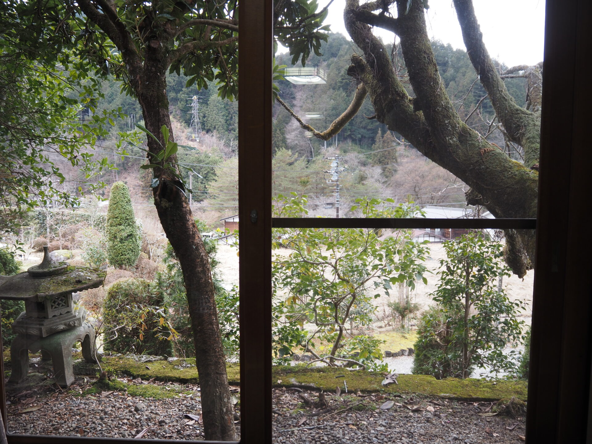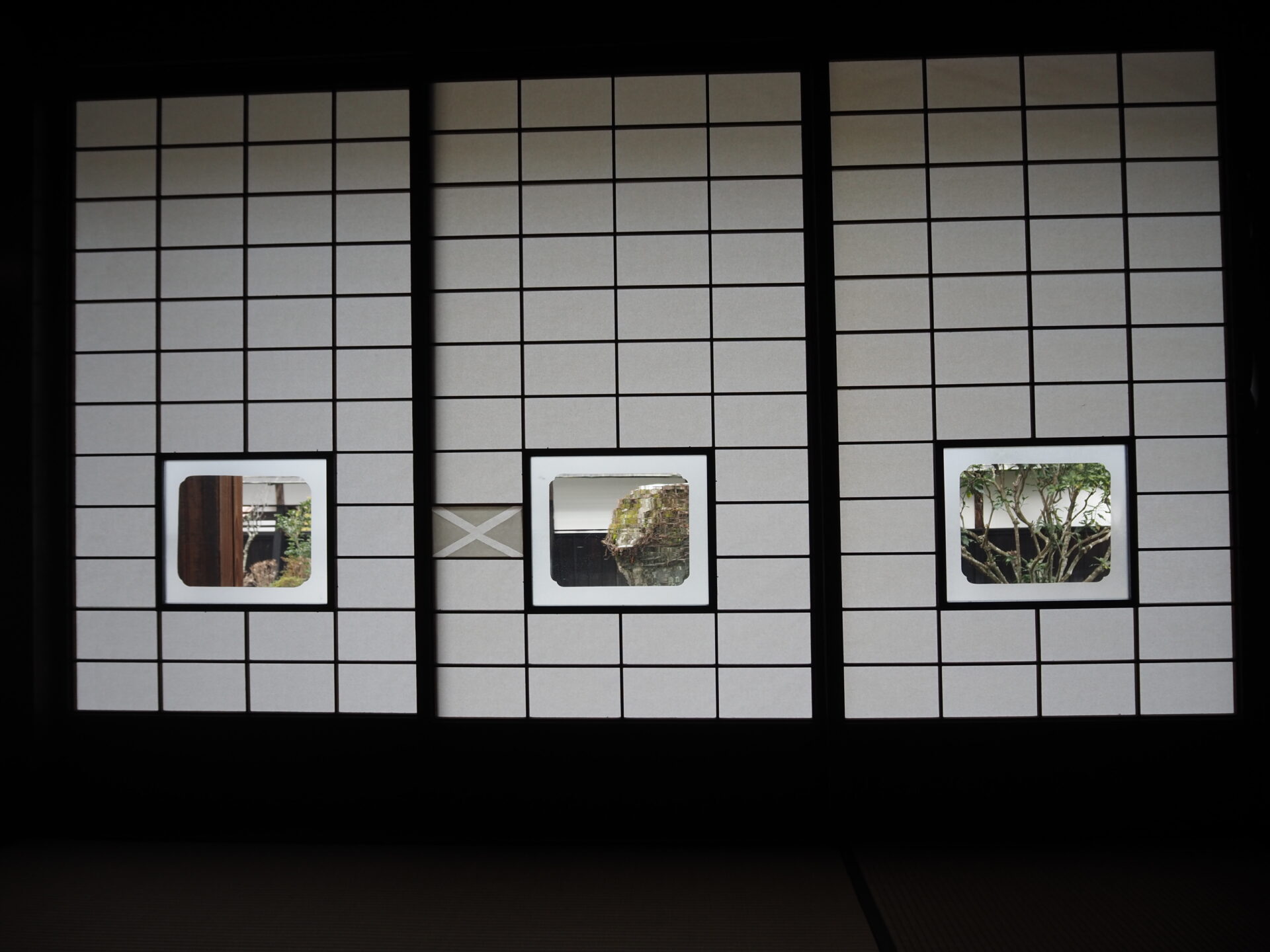写真ではわかりにくいけど、障子についた窓は敢えてゆらゆらしたような模様にしているらしい。理由は景色がより美しく見えるから、と。普通の窓になってるのは壊れて修理したかららしい(笑)