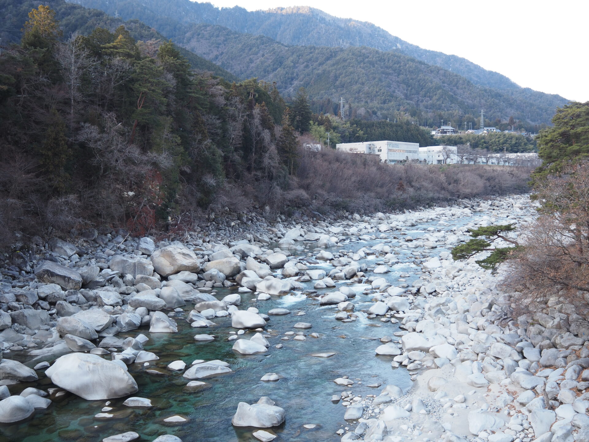 この辺の川は何でこんなにごつごつした白い岩がいっぱいあるんだろう?!